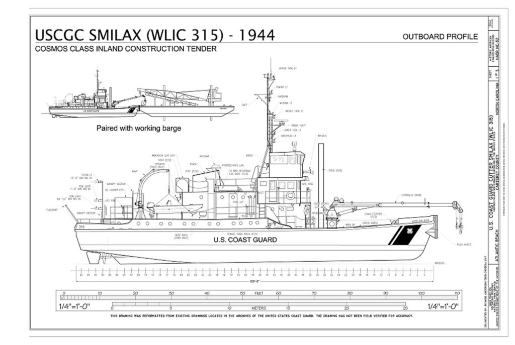 Coast Guard Cutter Smilax, of the Cosmos-class ships, was commissioned in 1944 as the seventh of eight Inland Buoy Tenders. All but one of those cutters have been decommissioned. These ships perform Aid to Navigation (AtoN or ATON) work, inland construction, and Search and Rescue (SAR) if needed. Displacing 175 long tons, the Smilax is 100′ in length, with a crew of fourteen.