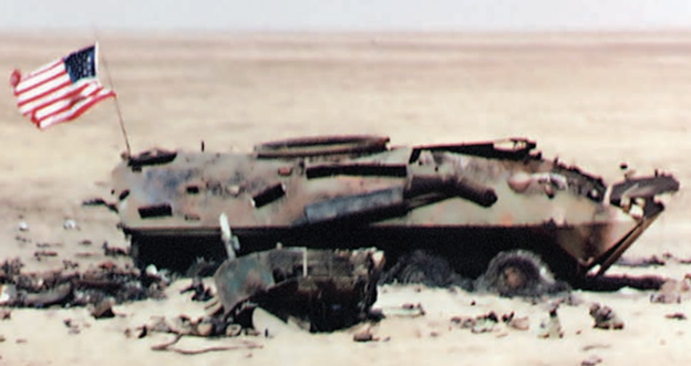 Coalition air and anti-armor fire tore into the Iraqi column, but at a terrible cost. A malfunctioning missile from a U.S. Air Force A-10 Thunderbolt II slammed into a Marine vehicle, and in the confusion, friendly fire helped turn OP-4 into a smoking wreck of shattered LAVs. Eleven Marines were killed, but Iraq’s western thrust was badly mauled and stalled north of the berm.