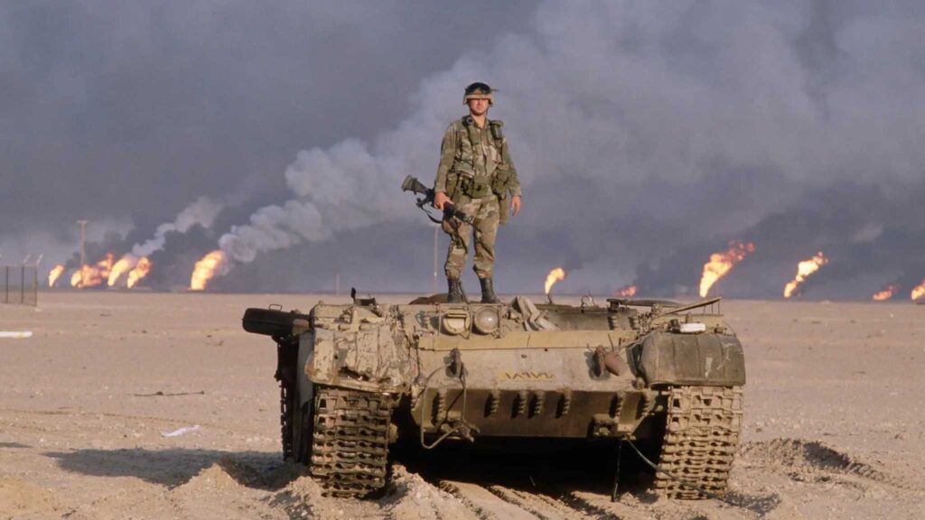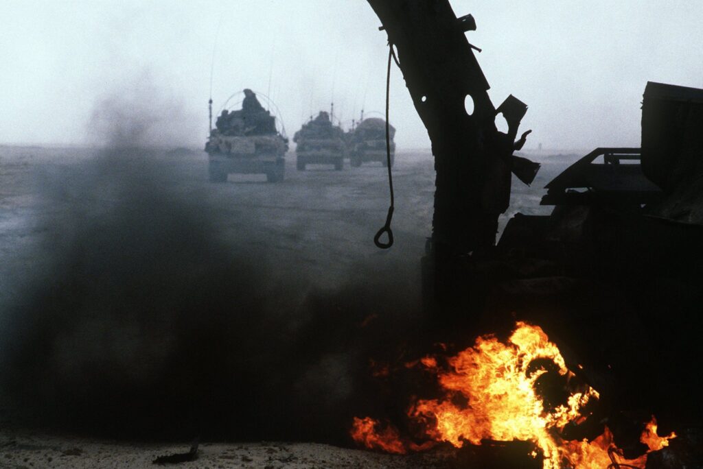 In late February 1991, the desert along the Iraq–Kuwait border was a wholly unremarkable and barren place. There were no towns to name the coming battle; just wind, dust, and a flat horizon marred only by burning oil wells and the silhouettes of armored vehicles.