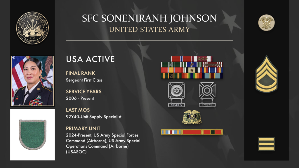 The following Reflection represents SFC Soneniranh Johnson’s legacy of their military service from 2006 to Present. If you are a Veteran, consider preserving a record of your own military service, including your memories and photographs, on Togetherweserved.com (TWS), the leading archive of living military history. The Service Reflections is an easy-to-complete self-interview, located on your TWS Military Service Page, which enables you to remember key people and events from your military service and the impact they made on your life.