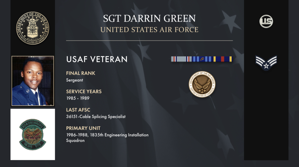 The following Reflection represents Sgt Darrin Green’s legacy of their military service from 1985 to 1989. If you are a Veteran, consider preserving a record of your own military service, including your memories and photographs, on Togetherweserved.com (TWS), the leading archive of living military history. The Service Reflections is an easy-to-complete self-interview, located on your TWS Military Service Page, which enables you to remember key people and events from your military service and the impact they made on your life.