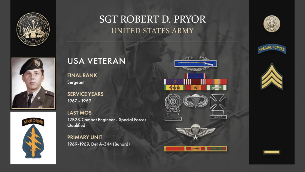 The following Reflection represents SGT Robert D. Pryor’s legacy of their military service from 1967 to 1969. If you are a Veteran, consider preserving a record of your own military service, including your memories and photographs, on Togetherweserved.com (TWS), the leading archive of living military history. The Service Reflections is an easy-to-complete self-interview, located on your TWS Military Service Page, which enables you to remember key people and events from your military service and the impact they made on your life.