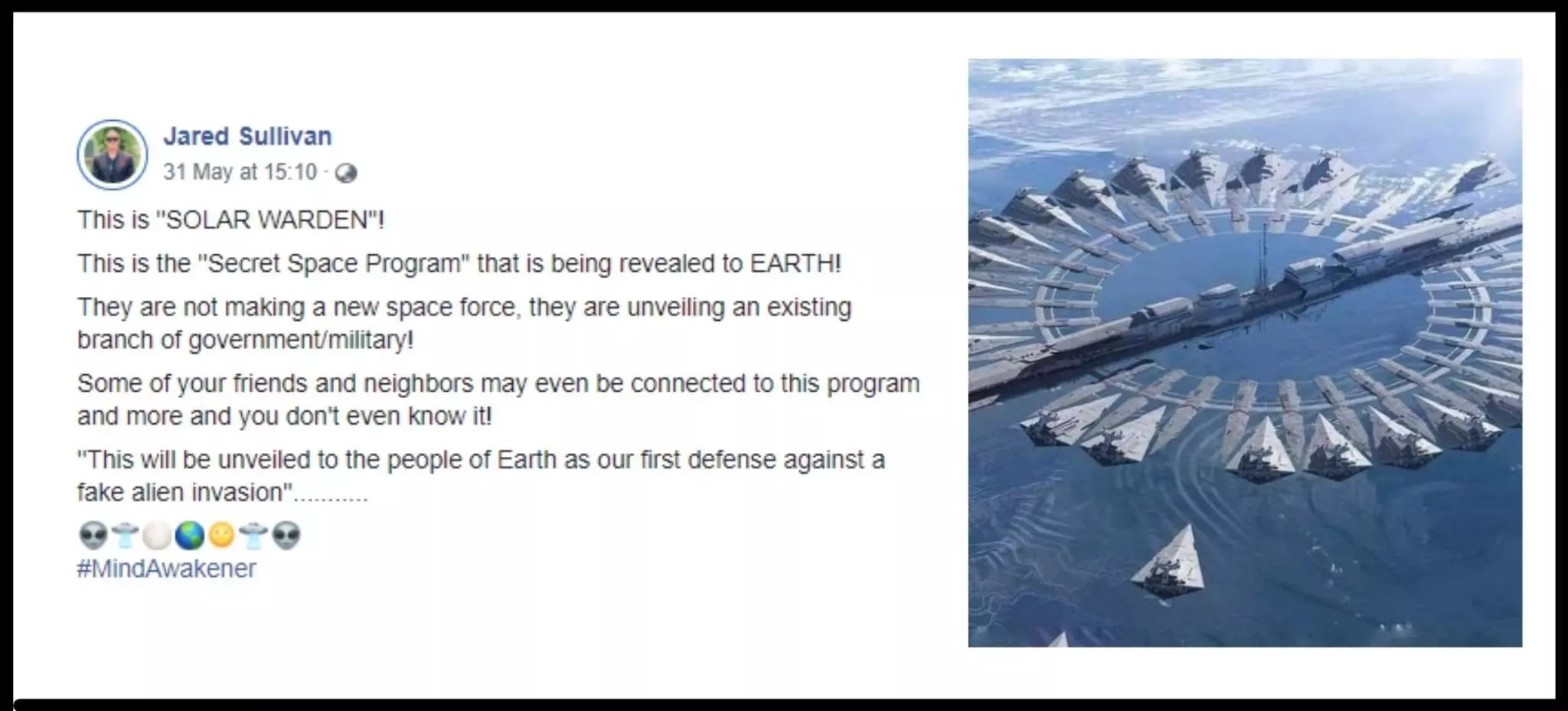 That did not stop Solar Warden believers from declaring victory. A widely shared post overlaid a dramatic spaceship image with text insisting, “This is Solar Warden… They are not making a new Space Force, they are unveiling an existing branch of government/military,” it claimed the fleet would be revealed as humanity’s first line of defense, even against a staged “fake alien invasion.”