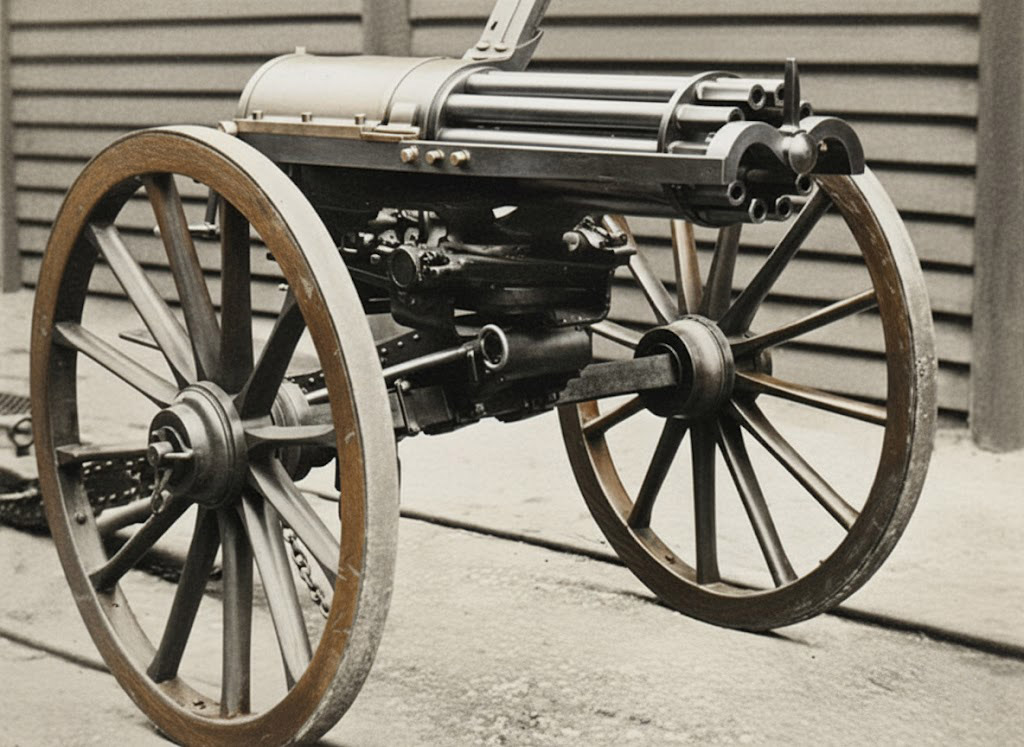 A cluster of barrels revolved around a central axis as the gunner turned a hand crank. Every quarter-turn married a fresh cartridge to a fresh barrel, fired it, and then offered the hot metal a chance to breathe and cool while the next barrels took their turn. That rotating logic beat fouling, and redistributed heat. A trained crew could pour out a sustained stream of fire at a time when armies were still using black powder and hand-loaded muskets.