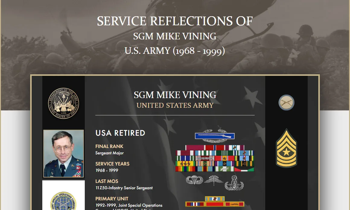 The result is a beautiful 12-inch-wide presentation of a Veteran’s entire Military Service Story, from enlistment to separation, complete with their personal Military Service Plaque. Veterans can download and save the plaque as a PDF file or share it with family and friends via a personal web address.